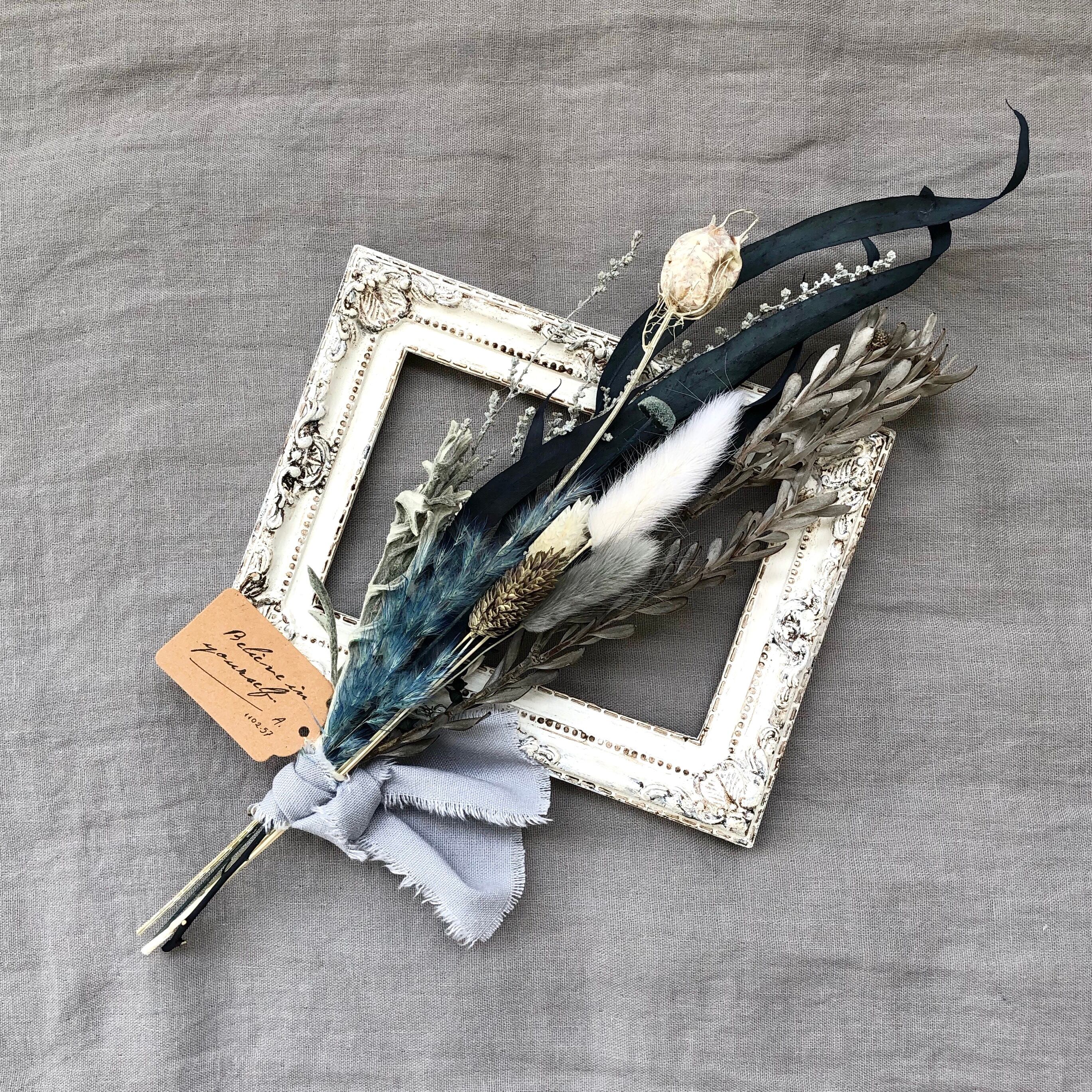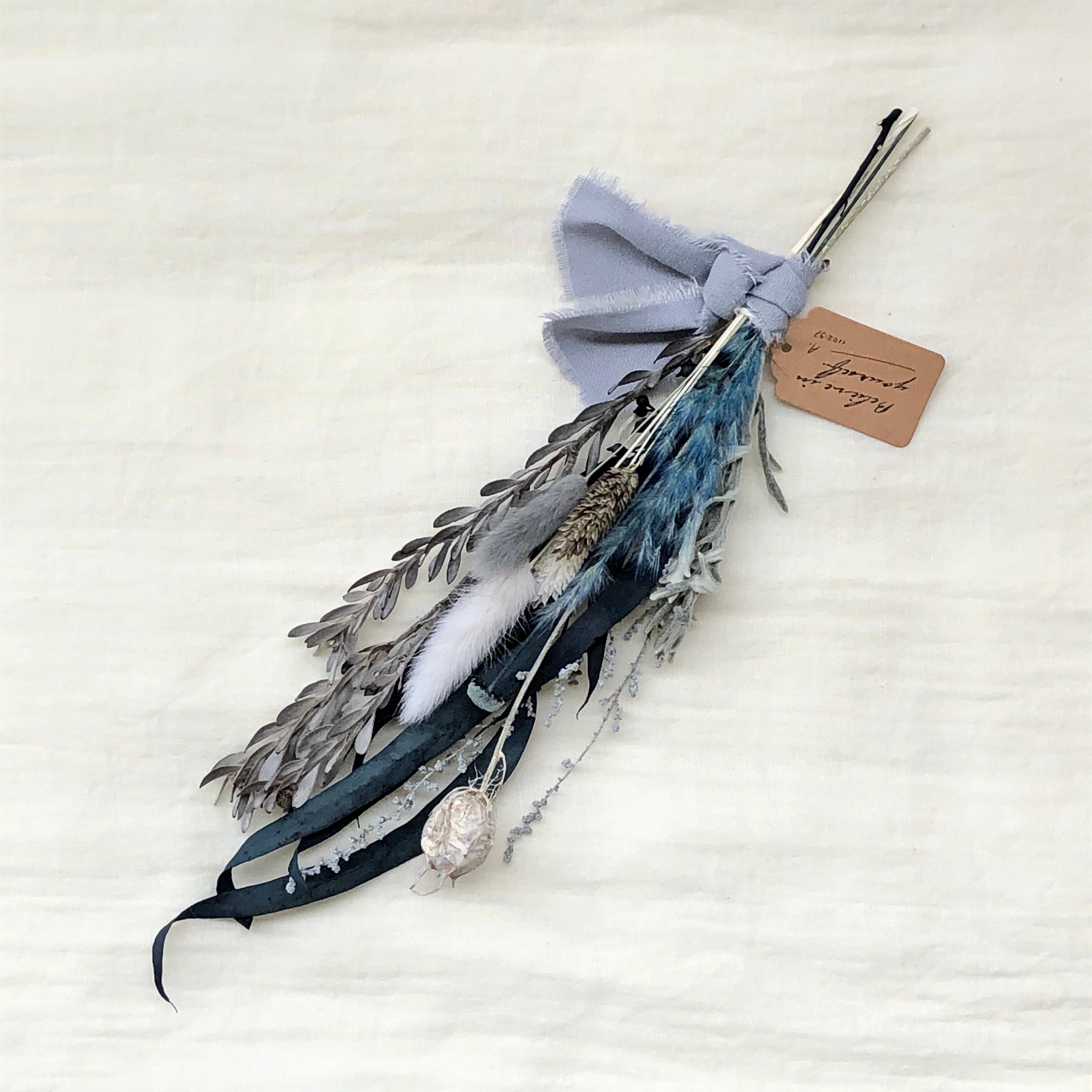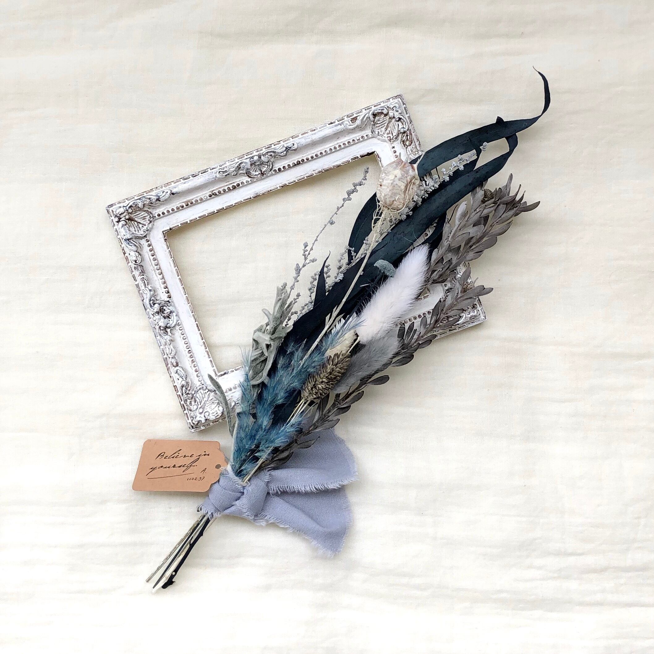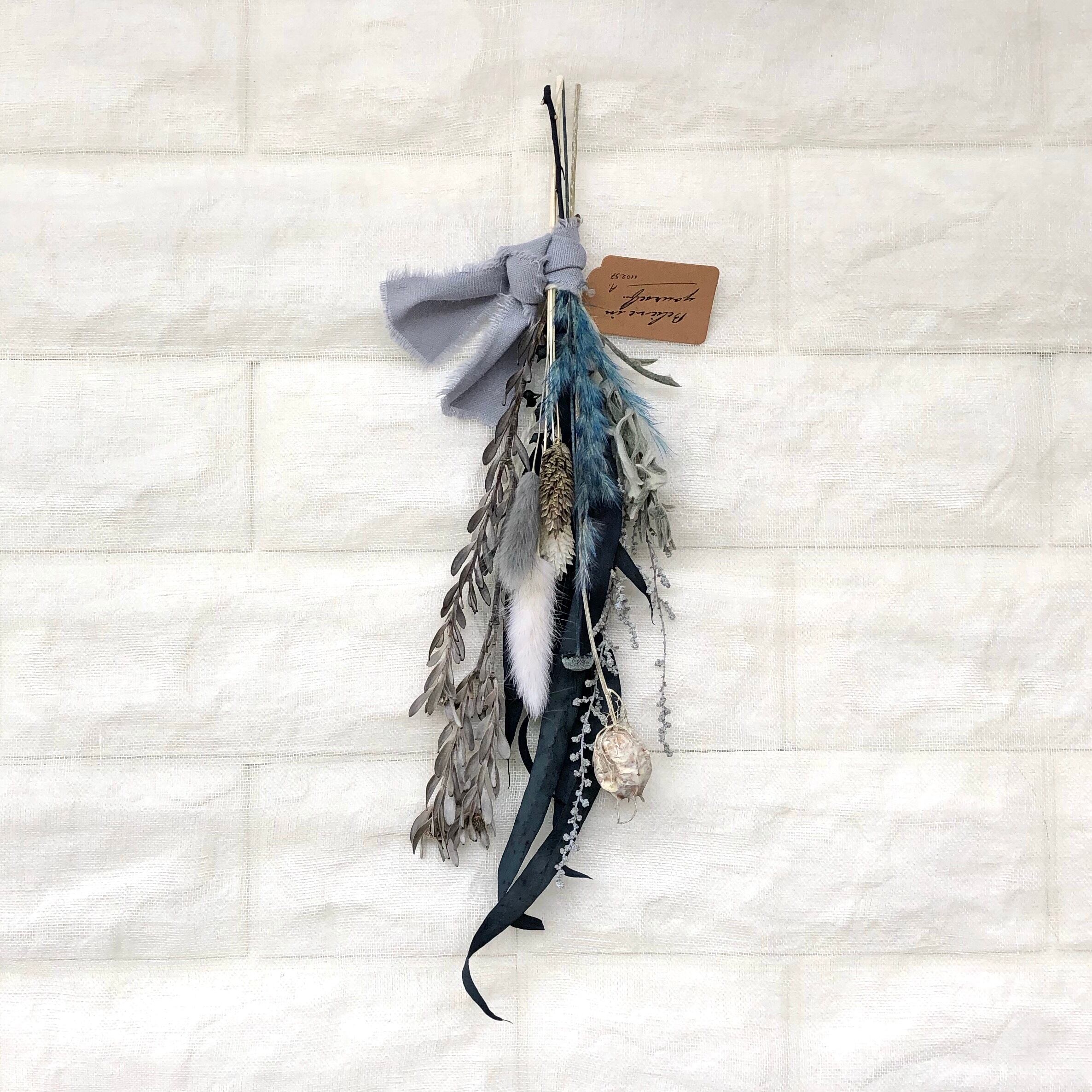 花材:ユーカリエキゾチカ、ダスティミラー、ラスカス、ボアプランツ、パンパスグラス、ピンキーボタン、ニゲラ、ソフトスーペ等9種