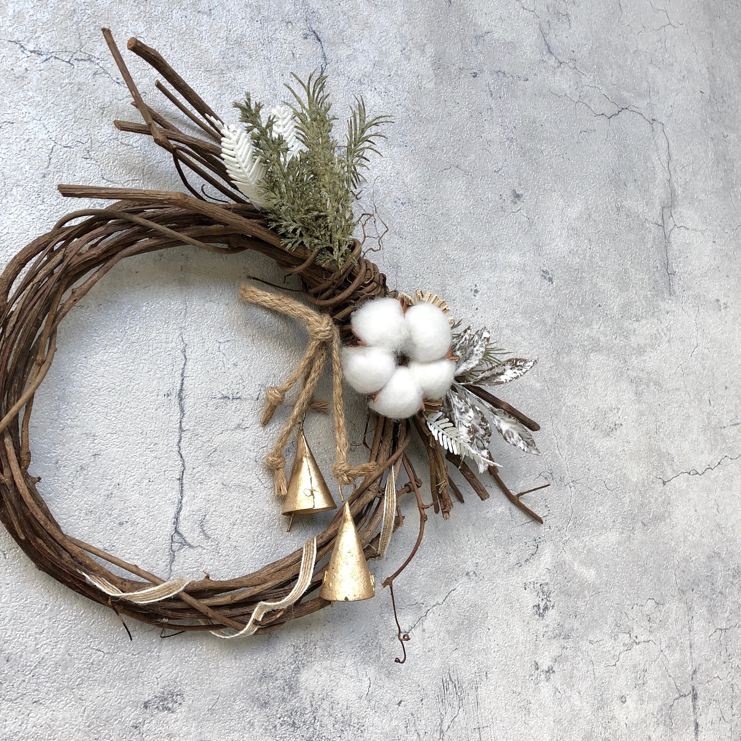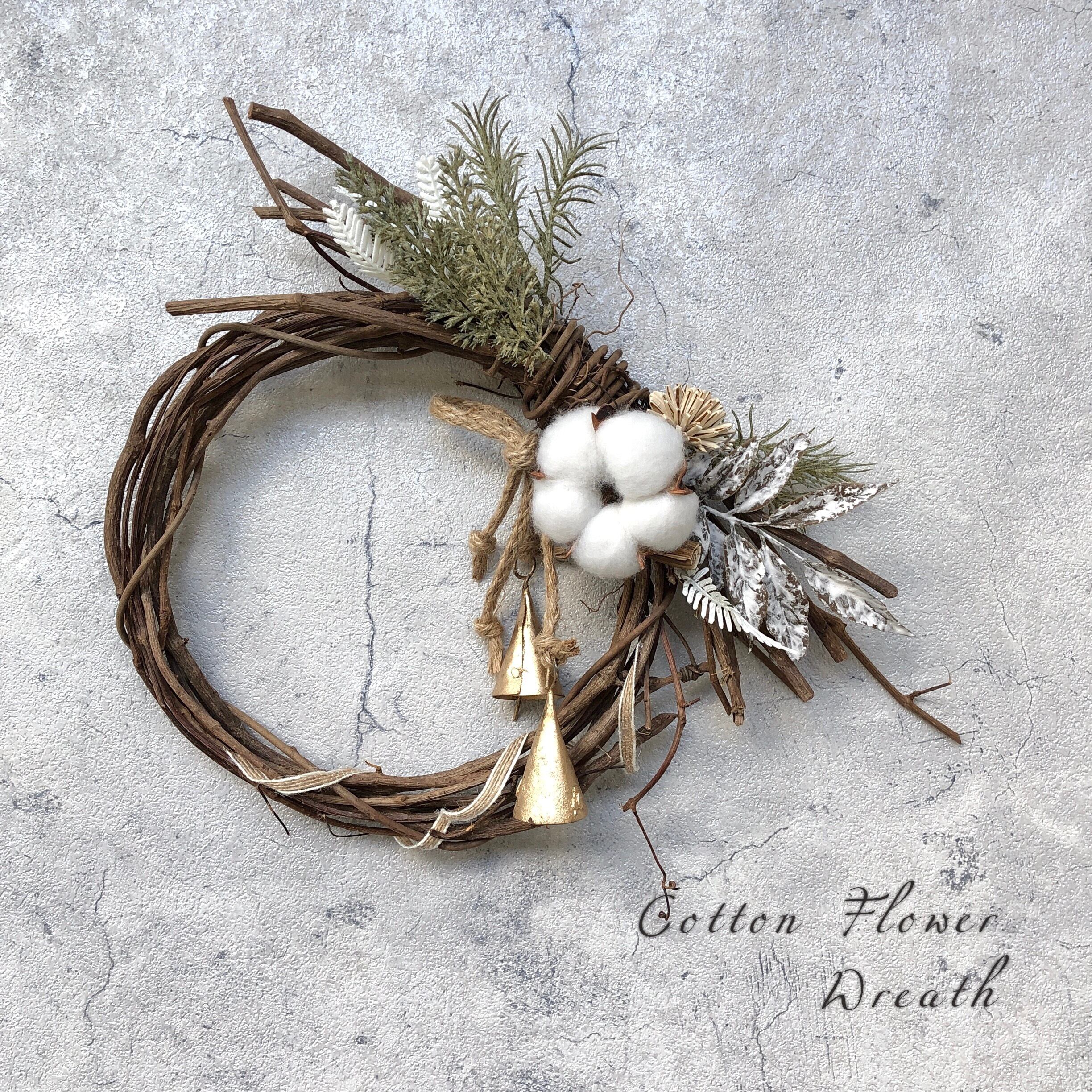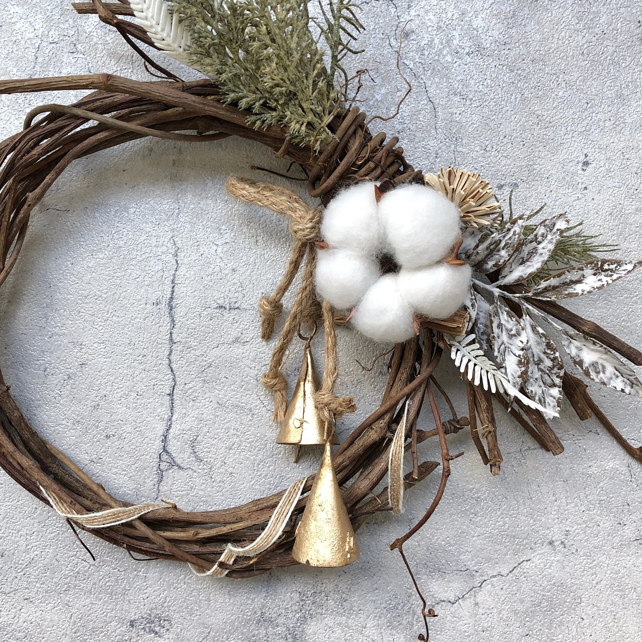 ナチュラル結びのリース台に、コットンフラワー、アーティフィシャルフラワー(造花)、ブラウンソラフラワー、手作りのアンティーク調ベルをあしらい、シンプルでおしゃれなドアリースに仕上げました。