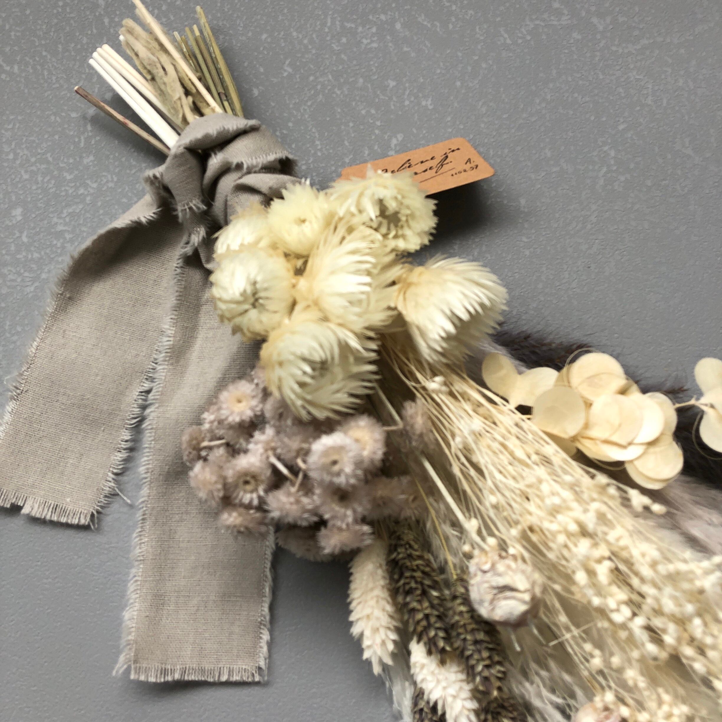 【花材】シルバーデイジー、ヤマイモの花殻、ポアプランツ、ニゲラウォッシュホワイト、イモーテル、プルームリード、テールリード、ススキ等9種