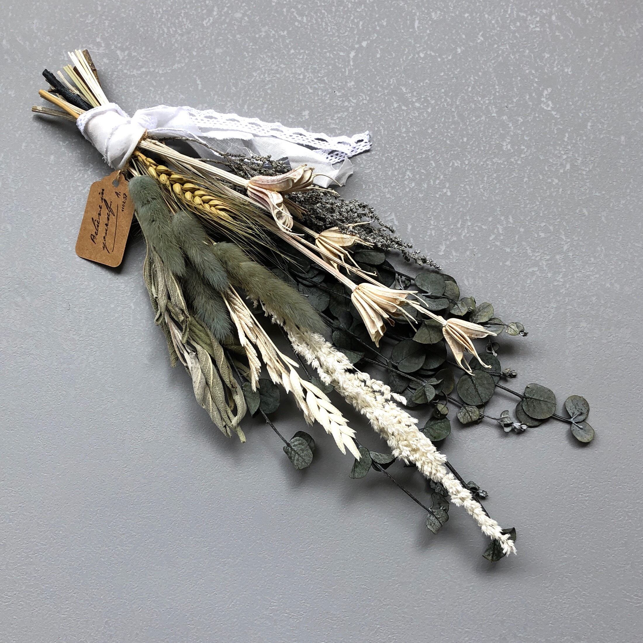 【花材】ソフトユーカリ小葉、ラグラス、セージ、ソフトスーペ、アマランサス、小麦、ニゲラ オリエンタリス等8種