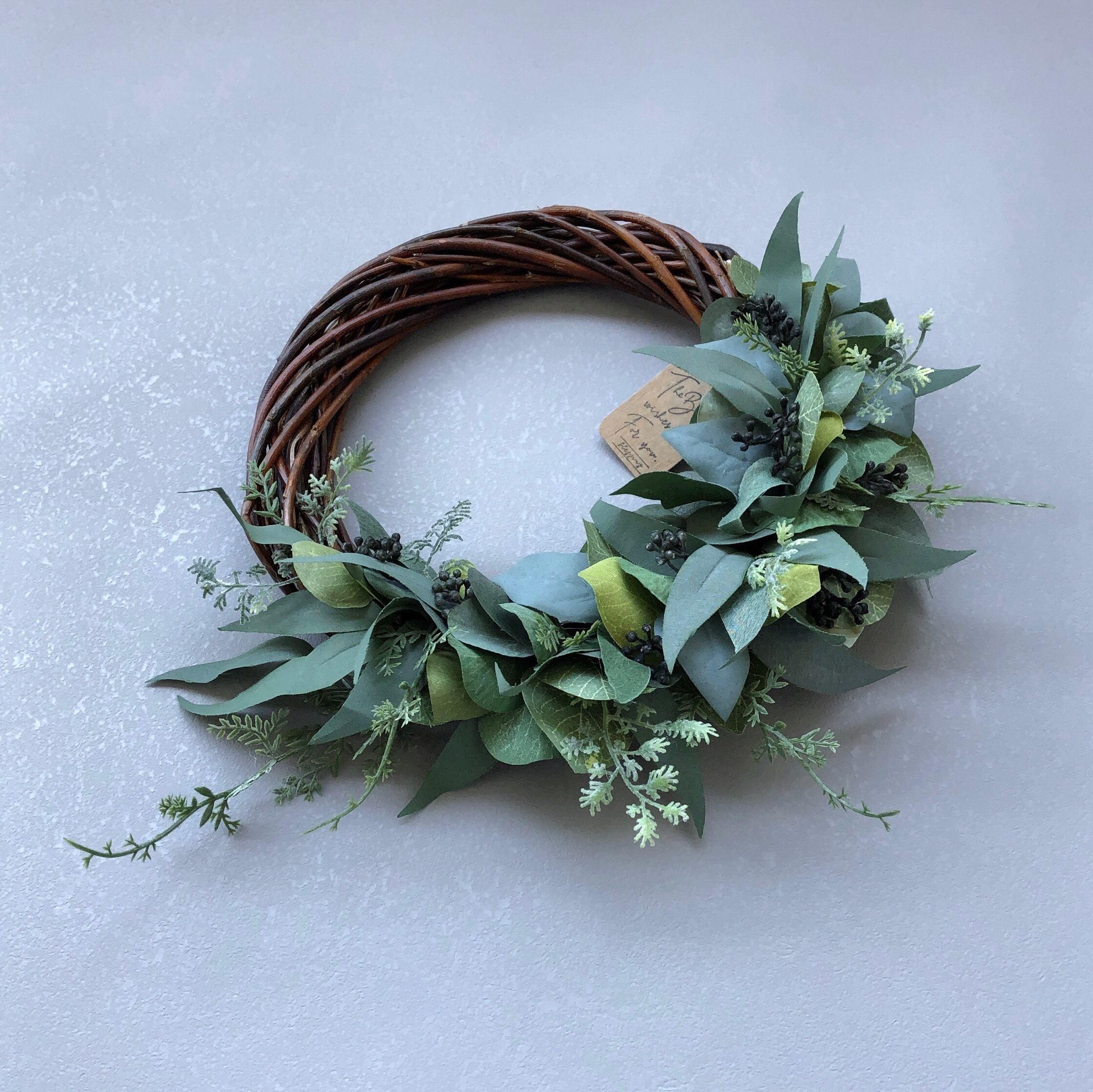丸みをおびた独特の形が可愛いユーカリポプルス、細葉のウィローユーカリ他、数種のグリーンをふんだんに使用した、シンプルなアーティフィシャルフラワー(造花)のグリーンリースです。