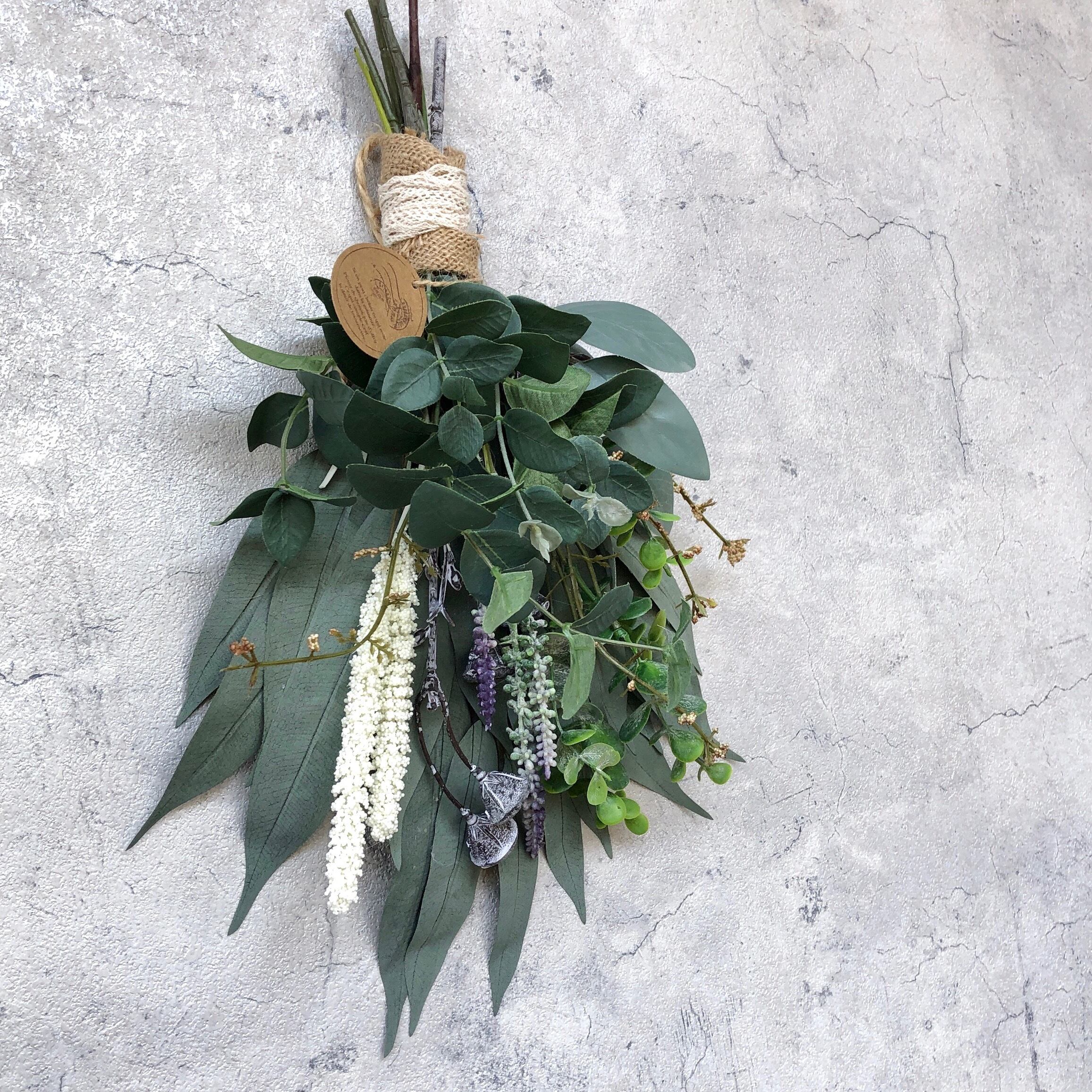くすみカラーのウィローユーカリをベースに、ユーカリ小葉、キシミア、ラベンダー、ユーカリの実、セタリア等、国内メーカーのアーティフィシャルフラワー(造花)を、贅沢に使った爽やかなグリーンスワッグです。