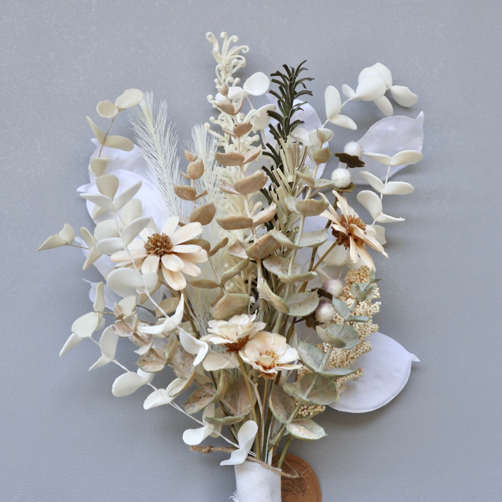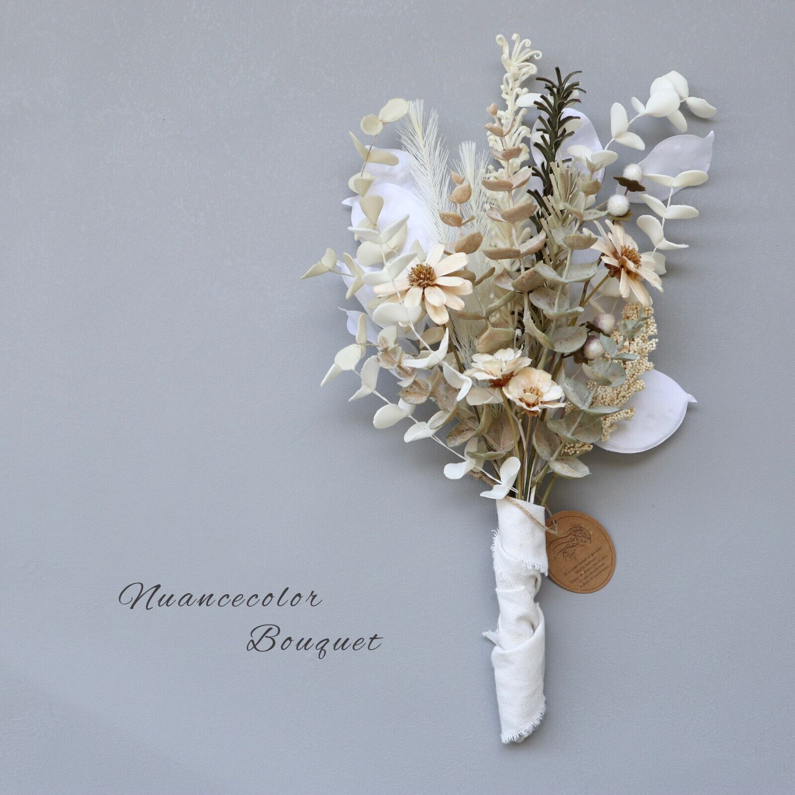 ホワイト&クリームのユーカリ小葉、珍しい白のルナリアシード、テールリード、実物、ピンクベージュ&グレージュのユーカリ等でニュアンスカラーの上品なブーケにしました。