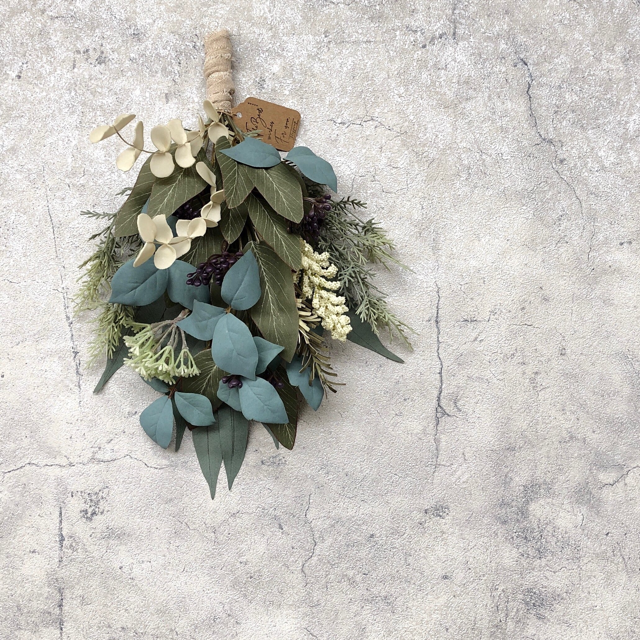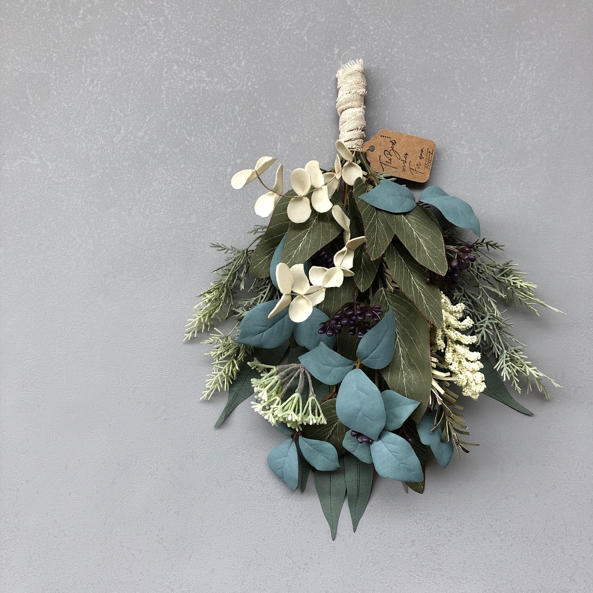 くすみグリーンとオフホワイトの三種のユーカリに、パステルカラーのキシミア他、マットで落ち着いたグリーン系の素材を合わせたスワッグになります。
